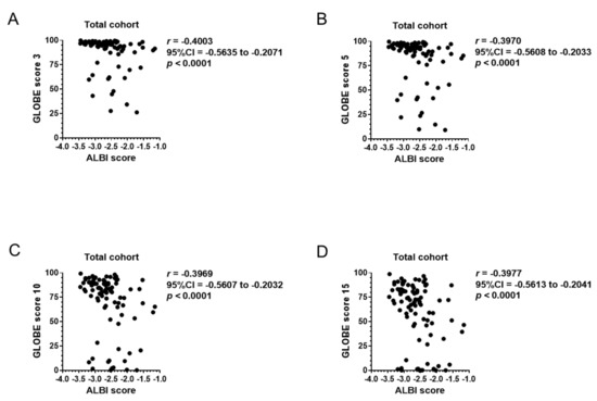 3.4. Correlation of Baseline ALBI Score with GLOBE Score, UK-PBC Score, and MELD Score