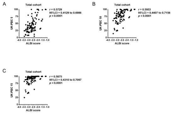 The two emerging prognosis scores, GLOBE score and UK-PBC score, focused on transplant-free survival based on the patients’ response to one year of UDCA therapy. While the ALBI score before UDCA therapy correlated with both scores, the correlation seemed to be greater with UK-PBC risk score than GLOBE score based on r values (Figure 4 and Figure 5). The greater correlation between ALBI score and UK-PBC score might be prevalent because these scores do not include age in their calculation. Though the correlation between the baseline ALBI score and GLOBE or UK-PBC score did not present stronger correlation with r values greater than 0.7, it might be partially attributed to the patients’ response to 1-year UDCA therapy [33].