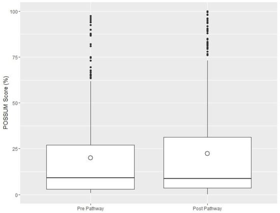 Cumulative P-POSSUM scores pre- and post-ELPQuiC implementation—circle represents the mean value.