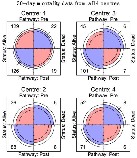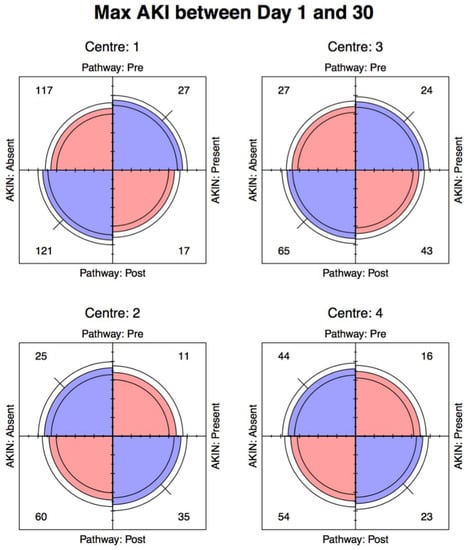 For our primary outcome; incidence of AKI between pre- and post-ELPQuiC implementation on day 1 post-op, the Mantel-Haenszel odds ratio (95% CI) for the four centres was 0.93 (0.72, 1.61). Using four-fold plots, crude numbers for day 1 incidence of AKI for each centre demonstrate that the odds ratios do not significantly differ from 1, but that the precision of the data is low (Figure 1 and Figure 2). Additionally, the cumulative rates of AKI for day 1 post-surgery were 18.4% versus 19.8% (pre- and post-pathway, respectively), with the data for each centre and combined data for all 4 centres showing no statistical significance (Centre 1; p = 0.460, Centre 2; p = 0.346, Centre 3; p = 0.319, Centre 4; p = 0.817, pooled p = 0.686).