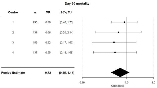 On day 30 after surgery, the Mantel-Haenszel odds ratio (95% CI) for the 4 centres was 0.56 (0.31, 1.00) (Figure 3). Using four-fold plots, crude numbers demonstrate that the day 30 incidence of AKI does not significantly differ from day 1, but the precision of the data is very low and varied across the centres (Figure 4).
