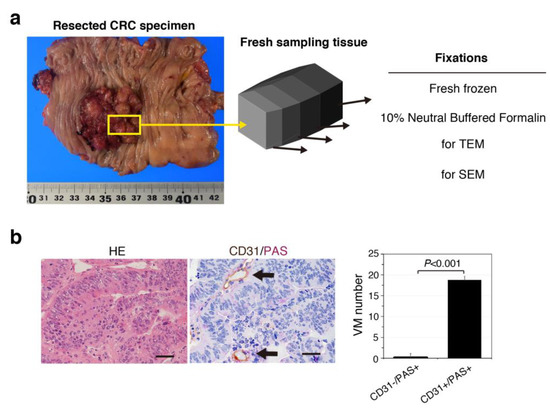 CD31/PAS double-stained sections were viewed using light microscopy at a magnification of 400× and analyzed independently by two expert pathologists (A.N. and H.T.). Vessels/lined spaces stained with CD31 were defined as endothelium-dependent vessels. Channels enclosed by colorectal cells (identified by the absence of endothelial cells as confirmed by hematoxylin and eosin (HE) staining), lined by PAS-positive material, and negative for CD31 immunostaining were defined as VM. The average number of VM channels and endothelium-dependent vessels on each slide was determined in areas without necrosis in 10 randomly selected fields. The proportion of VM structures among of all vessels was calculated as the number of VMs/(the number of VMs + the number of CD31+ structures).