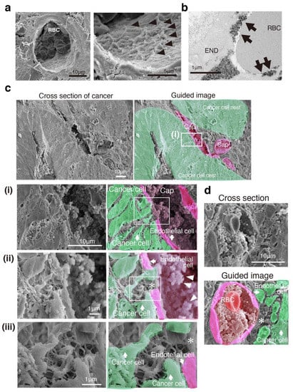 A capillary is a small blood vessel composed of endothelial cells ranging from 5 to 10 µm in diameter, and is just wide enough for a red blood cell (RBC) to squeeze through [20]. Cancer cells are generally less than 10 μm in diameter and chaotically overlap. Because of this ultrafine structure, confocal laser scanning microscopy (CLSM) is not sufficient to visualize the relationship between cancer cells and capillaries, including VM formation. SEM imaging with electron staining can be used to examine the volume and morphology of endothelial GCX by comparing normal and disease capillaries, although images may not always reflect the real and true morphology [12,14].