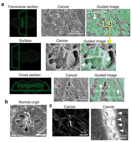 Currently, we cannot prevent artifacts such as shrinkage, dehydration, and chemical degeneration resulting from the process of human tissue sample preparation for observation by any microscopic methods, i.e., light microscopy (LM), TEM, SEM, and CSLM. Formalin fixation generally shrinks mammalian tissues more than fresh-frozen preparation. In electron microscopy, the fixation method for TEM imaging generally requires more time and technical expertise than that of SEM, leading to more artifacts than SEM. Even 3D reconstruction from images of CLSM with fluorescent staining cannot avoid formalin fixation. Therefore, interpretation of microscopy requires knowledge of the fine structure of cancer and experience of the numerous artifacts that arise from fixation, embedding, sectioning, and contrast staining [23].