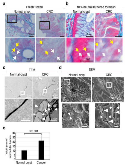 SEM and TEM images also showed that CRC tissues had much wider intercellular tunnels than normal epithelium (Figure 4c,d). Hence, even after considering the possibility of artifacts resulting from sample preparation, wide intercellular tunnels were evident in the patient-derived CRC tissues.