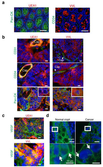 Cancer- and endothelial-related lectins expressed in cancer intercellular regions. (a) Merged images illustrating IF staining of lectins (UEA-1 and VVL: Red) and antibodies (pan-CK or CD34: green) with DAPI (blue). Scale bars: 10 μm. (b) Merged images illustrating IF staining of lectins (UEA-1 and VVL: red) and antibodies (CD31, CD34, and pan-CK: green) with DAPI (blue). Insets in the Pan-CK panel indicate high magnification. Cap: capillaries. Scale bars: 10 μm. (c) Merged images illustrating IF staining of lectins (UEA-1 and VVL: red) and antibodies (VEGF: green) with DAPI (blue). Scale bars: 10 μm. (d) Merged images illustrating immunofluorescent (IF) staining of CDH1 antibody (green) with DAPI (blue). Insets in upper images indicate lower high magnification images. Scale bars: 10 μm.