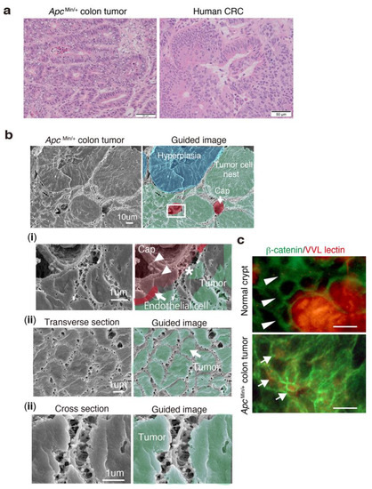 Murine colon cancer phenocopies the 3D network structure in human CRC tissues. (a) Representative hematoxylin and eosin (HE) images of frozen sections of ApcMin/+ colon tumor (left) and human colorectal cancer (right). Older ApcMin/+ mice developed several advanced colon tumors at 30 weeks of age, mimicking human adenocarcinomas. (b) Representative SEM and guided images of a colon tumor in an ApcMin/+ mouse at 30 weeks of age. (i) High magnification of the rectangle in the upper image showing the relationship between a tumor cell nest and a capillary. (ii) Transverse and (iii) cross sections of ApcMin/+ colon tumors. (c) Double IF staining of β-catenin (green) and VVL lectin (red) in the normal crypts and colon tumors of older ApcMin/+ mice. Scale bars indicate 5 μm.