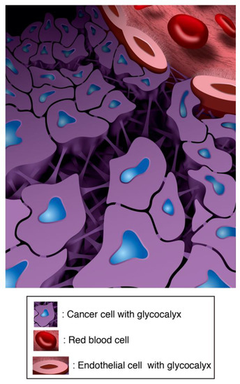 Hydrated gel-like layers (approximately 50–500 nm), called the glycocalyx (GCX), coat the surfaces of endothelial cells in the blood vessel lumen and are composed of glycolipids, glycoproteins, and proteoglycans [6]. Endothelial GCX has multiple functions, including mechanosensing and signal transduction, prevention of leukocyte adhesion and extravasation, modulation of shear stress on the plasma membrane, and regulation of the selective permeability barrier function of the structure [6], and is associated with many human diseases, including cancer [7,8].