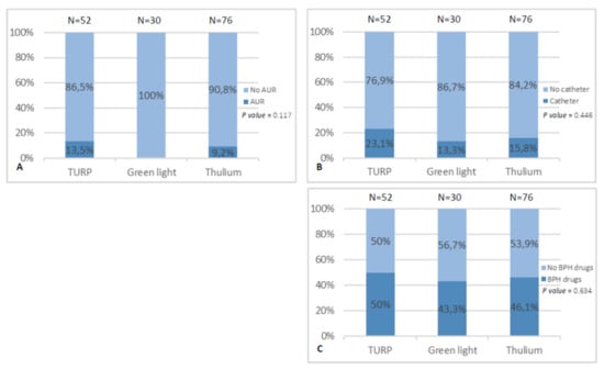 Surgical types versus three end points: (A) acute urinary retention (AUR) within 3 months after the operation; (B) catheterization status on discharge; (C) α-blocker usage 3 months after surgery.