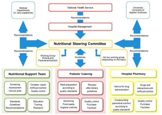 In hospitals, competent nutritional management should rely on two structures: nutritional steering committees and multiprofessional nutritional support teams (NSTs) (Figure 2). The nutrition steering committee is the legislative body with direct access to hospital management (staff function). This committee consists of representative nurses, physicians, pharmacists, dieticians, cooks, managers, controllers, NST members, etc. [43]. It is responsible for promoting good nutrition as a policy, with explicit written nutritional standards, protocols, and guidelines. Further responsibilities are meant to guarantee choice of a wide range of meals and to support continuous improvement and monitoring of the nutritional therapy in terms of quality, safety, and medical efficacy [44]. This committee is also responsible for education, teaching, training, and research coordination. The nutrition steering committee and the NST should also collaborate closely with other hospitals and, in case of tertiary urban hospitals with the University as well as national and international nutritional societies, for clinical research and teaching purposes. NST exercises an executive function throughout the hospital (Figure 3). An optimal functioning institutionalized NST as described above is possible in an urban setting due to the high personal and financial resources allocated. In suburban or rural regions, it is also possible to build an NST but in a reduced format. Our long-lasting clinical experience shows that a single dietician with a physician with special interest in clinical nutrition can overtake the most important clinical tasks of an NST. There is a great opportunity to perform high standing qualitative nutritional care in any setting even if a dietician is available only once a week.