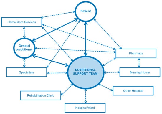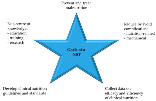 An NST also oversees and coordinates education and training in the field of nutritional management, according to the local possibilities and settings. This includes the dissemination of experience, expertise, and skills to trainees, students, and residents as well as other medical and para-medical staff. Multiprofessional work, connected thinking, and effective interdisciplinary communication are mandatory [54,55,56,71,72]. NST can ensure optimal treatment quality only when all professions and disciplines cooperate smoothly and the patient is given a place.