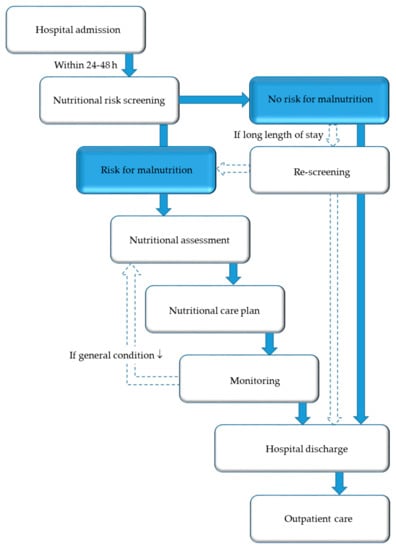The term “food chain” (Figure 1) has been adopted to emphasize that all stages in nutritional care must be adequate, from screening of patients and planning of menus to the distribution and serving of the food [36,37]. Because of the risks, and need for nutritional support, it is desirable for hospitals to appoint a multidisciplinary and multiprofessional nutrition steering group, including the clinical nutrition team, to oversee all aspects of nutritional care, from catering to artificial nutrition [36].