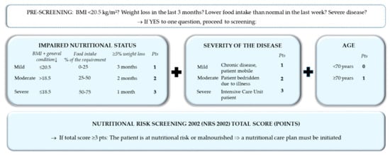The first step of nutritional care is the identification of patients at nutritional risk using simple, quick, and validated screening tools. Nutritional screening should be performed in all inpatients (and, preferably, also outpatients) within 24–48 h after hospital admission, respectively, as well as admission on the ward/intermediate care unit/intensive care unit. Nutritional screening should be performed by trained medical staff, at best, multi-professionally from nurses and physicians in charge of the patients, but, alternatively, from nurses, dietitians, or physicians only [59,60]. The Nutritional Risk Screening 2002 (NRS 2002) (Figure 5) is a widely used and well-validated screening tool used in hospitals to determine whether the patient is at nutritional risk [61]. If confirmed, a care plan has to be developed, based on more detailed nutritional assessment to determine the degree/severity of malnutrition. Patients with special metabolic, functional, or clinical problems that cannot be cared for by standard means should be referred to nutrition experts for more detailed nutritional assessment and design of a care plan.