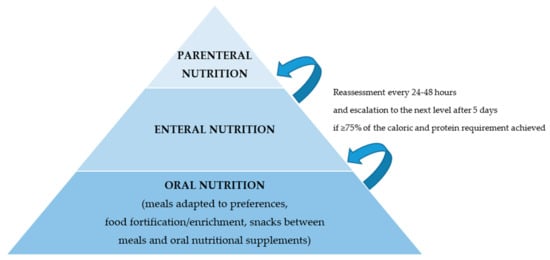 Strategy for nutritional therapy. The nutritional therapy is designed by an NST based on the patient’s needs and current situation. The most physiologic route of nutrition delivery is preferable. Nutritional therapy should be regularly re-evaluated and escalated if needed.