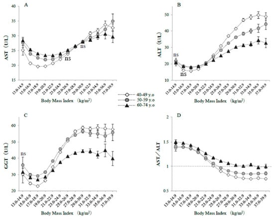 Raw serum enzyme activities, classified according to body mass index and age. The symbols indicate the mean values, and the vertical bars represent the 95% confidence intervals (CIs). BMI categories numbered 1–13 represent 13–14.9, 15–16.9, 17–18.9, 19–20.9, 21–22.9, 23–24.9, 25–26.9, 27–28.9, 29–30.9, 31–32.9, 33–34.9, 35–36.9, and 37–39.9 kg/m2. (A) AST, (B) ALT, (C) GGT, (D) AST/ALT ratios. The numbers of subjects in each BMI category were 185; 4028; 27,770; 60,097; 69,404; 56,582; 35,072; 18,206; 9054; 4268; 1950; 939; and 579 in their 40s; 198; 3332; 19,394; 45,814; 62,236; 55,433; 33,227; 15,689; 6741; 2712; 1168; 476; and 280 in their 50s; and 527; 5799; 27,686; 67,114; 96,657; 83,644; 46,035; 19,154; 7146; 2571; 944; 376; and 187 in the 60–74 year old category, respectively. The indication of ‘ns’ means no significant difference in values among three age groups in each BMI category. Otherwise, a significant difference was observed (ANOVA).