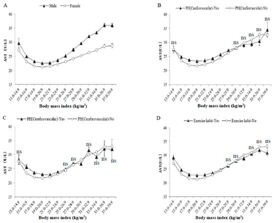 Raw serum AST activities, classified according to body mass index, sex, past histories, and exercise habit. The symbols indicate the mean values, and the vertical bars represent the 95% confidence intervals (CIs). BMI categories numbered 1–13 represent 13–14.9, 15–16.9, 17–18.9, 19–20.9, 21–22.9, 23–24.9, 25–26.9, 27–28.9, 29–30.9, 31–32.9, 33–34.9, 35–36.9, and 37–39.9 kg/m2. (A) Men and women, (B) past history of cardiovascular diseases, (C) past history of cerebrovascular diseases, (D) habitual exercise (≥30 min per session, at least twice weekly). The number of subjects in each BMI category was the same as in Table 1 and Figure 1. The indication of ‘ns’ means no significant difference in values between two groups in each BMI category. Otherwise, a significant difference was observed (ANOVA).