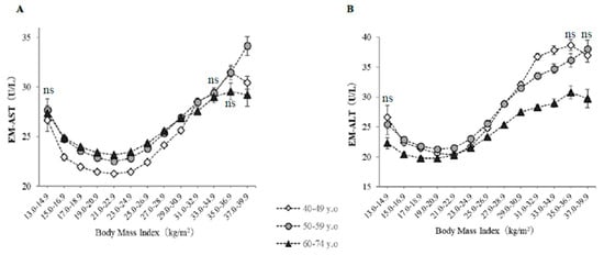 Estimated means of serum AST (EM-AST) and ALT (EM-ALT) activities, classified according to body mass index and age. The symbols indicate the estimated means of AST and ALT activities after controlling for the effects of age, sex, current smoking, daily alcohol intake, habitual exercise, physical activity, pharmacotherapy (for hypertension, diabetes, or dyslipidemia), history of cardiovascular disease, serum triglycerides, high-density lipoprotein cholesterol, GGT, and waist circumference. The vertical bars represent the 95% CIs. (A) EM-AST, (B) EM-ALT. The BMI categories numbered 1–13 are the same as in Table 1. The numbers of subjects are the same as in Figure 1. The indication of ‘ns’ means no significant difference in values among three age groups in each BMI category. Otherwise, a significant difference was observed (ANOVA).