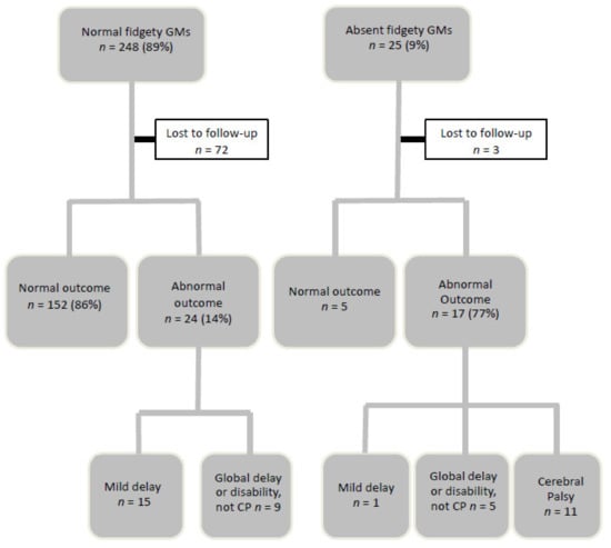 n = 248, 89%); 25 (9%) had absent fidgety movements, and 5 (2%) had abnormal fidgety movements. These results and the outcomes at three years of age are illustrated in
