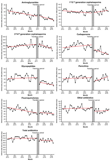 According to segmented regression analysis, there was a decreasing trend in the amount of aminoglycoside and quinolone consumption before the intervention (p < 0.001 for each antibiotic) (Table 2). Following the intervention, decreases in both level and trend of the total amount of antibiotics consumed were not statistically significant. However, the intervention had a prominent effect on the use of antibiotics designated as restricted. Just after the transition period, among the antibiotics designated as restricted, there was an immediate reduction in the use of carbapenems (coefficient −16.108, p = 0.033), glycopeptides (coefficient −12.287, p = 0.012), and other antibiotics (coefficient −16.092, p = 0.043). Although significant immediate change was not observed in the amount of 3rd/4th generation cephalosporins use, including that of ceftazidime/cefepime, there was a significant decreasing trend following the intervention as compared with that during pre-intervention (coefficient −8.459, p = 0.004). In addition to the immediate response, use of carbapenems showed a significant decreasing trend after the intervention (coefficient −2.029, p = 0.027). Penicillins were not subject to restriction, but their use decreased immediately after the intervention. Following an immediate reduction after the transition period, there was no significant change in the trend of use of glycopeptides, penicillins, and other antibiotics.