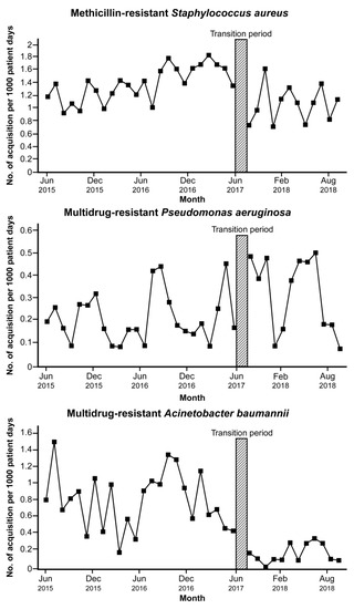 In segmented regression analysis, a significant increasing trend was observed in the incidence of MRSA acquisition before the intervention (coefficient 0.03, p < 0.001) (Table 3). Immediately following the transition period, the estimated incidence of MRSA acquisition decreased (coefficient −0.71, p < 0.001). There was no significant changing trend in the incidence of MDRAB and MDRPA before the intervention. The incidence of MDRAB acquisition dropped after the transition period (coefficient −0.62, p = 0.014); however, MDRPA acquisition increased (coefficient 0.21, p = 0.035). There was no significant trend change in the incidence of acquisition of each MDRO after the intervention.