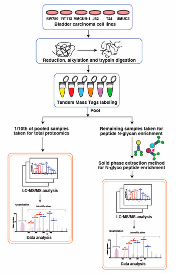 Workflow for the quantitative global proteomics and glycoproteomics analysis of bladder carcinoma cell lines. For sample processing, proteins were extracted from the bladder carcinoma cell lines and digested using trypsin. Each cell line was tagged using the 6-plex Tandem Mass Tag (TMT) labeling kit and lyophilized. One tenth of the samples were taken for global proteomics and the remainder was enriched using the glycopeptide enrichment protocol. The samples were run on Q Exactive HF-X Hybrid Quadrupole-Orbitrap mass spectrometer and MS2-based quantitation was achieved. The files were searched against Mascot and Sequest HT search engines. Data were acquired in technical replicates.