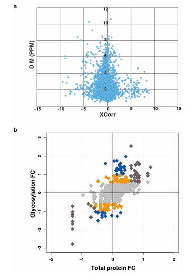 (a) Distribution of the mass error from the parent ion measurement against the SEQUEST Xscore; (b) global presentation of proteomic and respective glycosylation occupancy. Yellow datapoints represent differential glycosylation occupancy with fold change ≥ 1.5 and blue datapoints with fold change ≥ 2 on proteins that are unchanged in proteomic data. Brown datapoints represent proteins and glycosylation occupancy with similar dysregulation pattern (overexpressed/increased glycosylation occupancy and/or downregulated/reduced glycosylation occupancy). Grey datapoints represent proteins that are unchanged in both datasets.