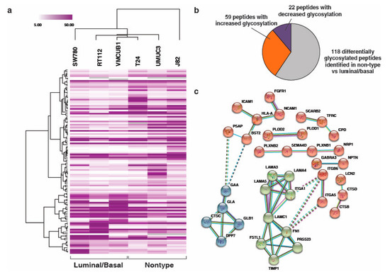 (a) Supervised clustering of the molecular subtypes of bladder carcinoma cell lines. A t-test was conducted on the glycoproteomic data that identified 118 N-linked glycopeptides (corresponding to 84 proteins) which were differentially glycosylated in the non-type cell lines (T24, J82, and UMUC3) as compared with the luminal/basal subtype (SW780, RT112, and VMCUB-1) (p ≤ 0.05); (b) pie chart depicting the number of N-linked glycopeptides which depicts increased and decreased glycosylation in the non-type cell lines (p < 0.05); (c) protein–protein interaction network enriched in the non-type cells with highest confidence (0.90) acquired using STRING functional protein association network tool.