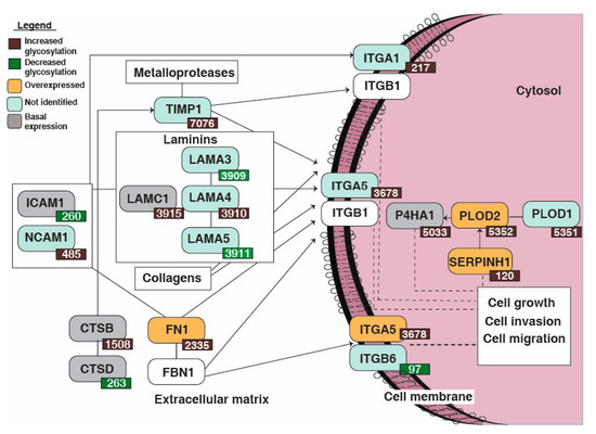 The glycosylation levels of ITGA5, Procollagen-lysine, 2-oxoglutarate 5-dioxygenase 2 (PLOD2), Serpin H1 (SERPINH1), Prolyl 4-hydroxylase subunit alpha-1 (P4HA1), FN1, CTSB, ITGA5 and LAMC1 were increased (1.5-fold) and were upregulated in the non-type cells. Neural cell adhesion molecule 1 (NCAM1) and LAMA4 showed only increased glycosylation (1.5-fold) and were not identified in the global proteomics data. (CTSD) and (ICAM1) showed decreased glycosylation and were downregulated (1.5-fold). ITGB6 also showed decreased glycosylation but was not identified in the total proteomics data.
