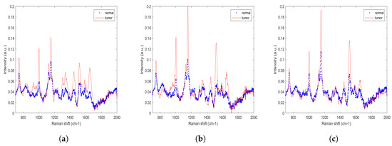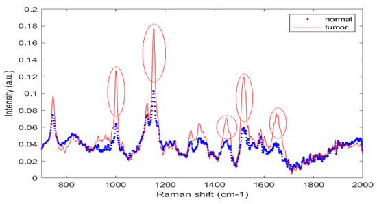 Figure 1 presents normalized mean spectra of healthy or normal and tumor or OSCC tissues of the oral mucosa. The fingerprint region (700 cm to 1800 cm) in biological tissues is rich in proteins, nucleic acids, amino acid, carbohydrates, and lipids. The literature has shown that the normal tissue spectral peaks are lipid-dominated peaks while the malignant tissue peaks are protein-dominated peaks [14,15,19,33,34]. Malignant or tumor samples had higher peaks than normal tissues. Peaks at 1004, 1156, 1339, 1450, 1523, and 1656 cm dominated the spectra of normal tissues, whereas peaks at 754, 1064, 1168, and 1220 cm dominated those of malignant or tumor tissue samples. The sharp and high peak at 1004 cm is attributed to the symmetric ring breathing mode of phenylalanine, which is an amino acid and is observed in protein-enriched malignant tissue spectra [14]. A sharp and intense peak at 1155∼56 cm arose from the proteins and was dominated by the protein signal in the tumor tissues [27,34]. The peak at 1220∼1240 cm is associated with lipids and =CH bending. The high peak at 1449∼50 cm is associated with CH bending, and is associated with a protein [33,34]. The peaks at 1339 cm in the average tumor spectrum was associated with the adenine feature of nucleic acid [23]. At 1518∼1524 cm, a sharp and more intense peak is observed and is associated with the beta-carotene or porphyrin feature and was obtained in both normal and tumor samples [35]. The lower intensity from normal tissues may be a discharge by secretion. In one study [36], this peak was absent from the spectra of normal tissues. A broad and strong peak at 1650∼1655 cm is a characteristic of proteins in the alpha-helix structure of amide I, which yields a strong signal in the spectral of tumor tissues. In normal tissues, the small peak at 1655 cm is generated by the bond in lipids or phospholipids, and not amide I [14,34]. Normal tissues yielded a small peak at 1123 cm, which is attributable to the skeletal stretch in lipids, while tumor tissues had a () stretching mode of protein. Tumor tissues yielded a high peak at 750 cm and a small peak at 823 cm due to the Tryptophan and Tyrosine in protein, respectively [35]. Normal tissues yielded Raman peaks at 754, 1064, 1168, and 1220–84 cm ( bending) that are associated with the lipid. All of the above peaks were obtained from both normal and tumor tissues, with the strongest signals at 750, 1004, 1155, 1449, 1522, and 1656 cm. In tumor tissue samples, protein, amide I, greater CH bending, amide III, and amino acid (Tryptophan or phenylalanine) yielded signals that enabled such tissue to be distinguished from normal tissues.