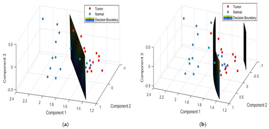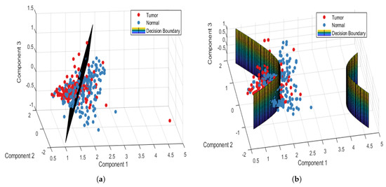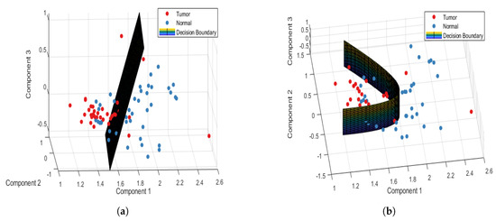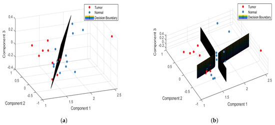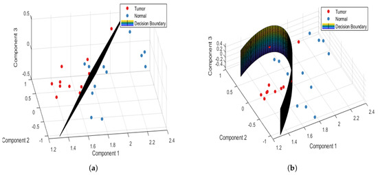 From the gingiva sub-site, 12 tumor samples and 11 normal samples were collected. Table 6 shows the performance table of the patient-wise approach at the gingiva sub-site. The PCA-LDA model differentiates gingiva tumor from normal tissue with an accuracy, sensitivity, and specificity of 91.30%, 91.66% and 90.90%, respectively, and the PCA-QDA model differentiates them with 87.12%, 75%, and 100%, respectively. Figure 7a,b plot the 3D decision boundary curve of the PCA-LDA and the PCA-QDA classifier models with the gingiva sample, respectively. The PCA-LDA model assumed linearity and variance-covariance homogeneity, whereas the PCA-QDA model had different feature covariance matrices for different classes and the consistency of a PCA-QDA model could not be predicted from a few samples, reducing the accuracy of the PCA-QDA model.