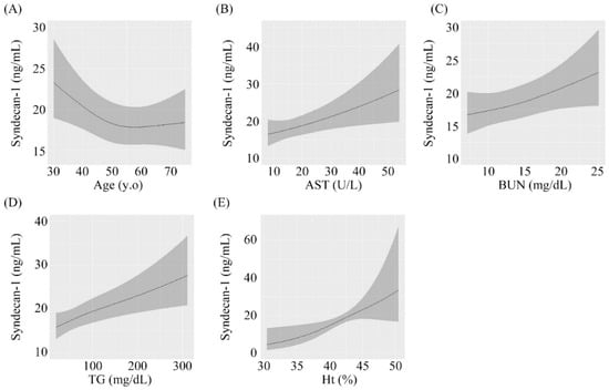 According to nonlinear regression analysis, serum syndecan-1 concentrations were significantly related to age, AST concentration, BUN concentration, triglyceride concentration, and Ht. These relationships were independent associations. Significant nonlinear associations were not observed for each variable.