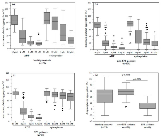 Platelet aggregability in healthy controls and patients. (a) Platelet aggregation in 29 healthy controls showed a physiological dose-dependent decrease with decreasing concentration of the added inductors ADP and epinephrine. (b) Physiological dose-dependent pattern of platelet aggregation in healthy controls was also found in 139 of the 208 patients. (c) Pathological platelet aggregation pattern was found in 69 patients. The platelet aggregation was significantly increased independent of the lowest added epinephrine concentration (0.5 µmol L−1) compared to non-SPS patients. (d) The median Δ-epinephrine aggregation was found to be 57% in healthy controls. Patients without platelet hyperaggregability revealed equivalent Δ-epinephrine aggregation compared to healthy patients (59% vs. 57%; p = 0.8190). ADP, Adenosine diphosphate; SPS, Sticky platelet syndrome.