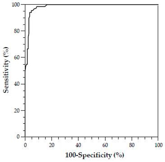 We performed a receiver operating characteristic (ROC) curve analysis, as depicted in Figure 2 (sensitivity vs. 100–specificity). The ROC analysis revealed a favorable cut-off value of ≤32% for Δ-epinephrine aggregation response distinguishing SPS patients from healthy controls and non-SPS patients with a sensitivity of 95.7% and a specificity of 95.2% (Figure 2 and Table 7). The AUC for Δ-epinephrine aggregation was 0.985 (95% CI 0.960–0.996) (Table 7). If the platelet aggregation analysis shows a value of less than 32% for the Δ-epinephrine aggregation response, it is highly probable that SPS can be diagnosed and initiating therapy with low-dose ASA may be considered.