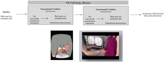 The efficacy of the illusory ownership over an artificial body (i.e., body-ownership illusion) as a method for modulating body representations in both healthy such as [1,2,3,4,5,6] and clinical population (such as individuals suffering of eating disorders [7,8], Complex Regional Pain Syndrome [9] and Disturbed Body Integrity [10,11] has been repeatedly reported in recent literature. Indeed, since from the traditional Rubber Hand Illusion [12], it was speculated if bodily illusions might be adopted in therapeutic settings [13,14,15,16,17] for enhancing positive rehabilitative outcomes. More recently, the research about body ownership illusions moves from the embodiment of a single body part (such as the hand [12] or the foot [10], towards the entire body. For example, in the Virtual Reality-Full Body Illusion (VR-FBI) [2,3,4,5] participants experience the illusion of ownership towards a full-body avatar. Traditionally, the avatar is showed with different physical dimensions (i.e., thinner or larger) respect to the participants. Interestingly, when participants experience successfully the illusion, they generally perceive themselves as fatter or thinner than they really are, according to the characteristics of embodied virtual body [2,3,4,5]. An example was offered by Normand and colleagues (2011) [18], who induced embodiment over a virtual body with a larger abdomen in a sample of males; immediately after this experience, participants perceived their own body as larger than the real physical dimensions, congruently with the embodied avatars’ characteristics. The illusion seemed to work also in the opposite direction: female participants who embodied avatars with skinny bodies tended to perceive their own bodies as slimmer [2,3,4,5].