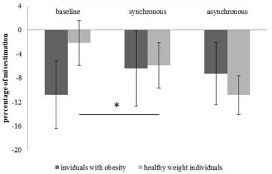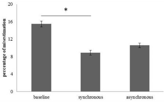 About the circumference estimation of the hips, means of the percentage of misestimation and standard error (bars) were showed for the three experimental condition (baseline, synchronous and asynchronous). * indicates a significant difference according to the Bonferroni-corrected p value of 0.025.