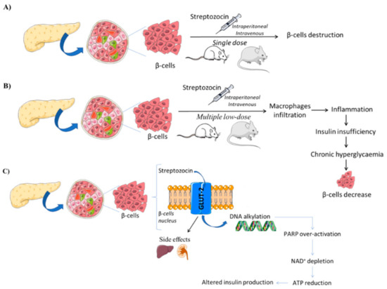 Streptozotocin (STZ), chemically known as N-(methylnitrosocarbamoyl)-α-d-glucosamine, is a naturally occurring compound produced by Streptomycetes achromogenes with antibiotic properties that are selectively taken up by pancreatic β-cells, causing its destruction [16,40]. After its intraperitoneal or intravenous administration, STZ behaves as a glucose analogue and is transported mainly by the glucose transporter subtype 2 (GLUT-2) [41] into the pancreatic β-cell, where it induces toxicity, mainly by producing DNA alkylation [16]. Due to DNA strand breaks, over-activation of poly-ADP ribose polymerase (PARP) leads to NAD+ depletion, cellular ATP reduction, and consequently, insulin production is compromised, as well as the cell survival, since there is a massive loss of energy [42]. As STZ enters the cell via GLUT-2, this is also expressed in other cells behind those from the pancreas, as the toxic action of STZ is not specific to pancreatic β cells, occurring also in hepatocytes and kidney cells (Figure 1) [43]. These are probably the reasons underlying the high mortality rate associated with this model.