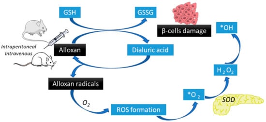 Alloxan administered doses range from 50 to 200 mg/kg (in mice) and 40 to 200 mg/kg (in rats), and they are dependent on the chosen strain and the route of administration (e.g., intraperitoneal and subcutaneous alloxan administration require doses up to three times of those administered by intravenous route) [16]. Alloxan induces DM models as a consequence of ROS mediated beta cell toxicity (Figure 2), allowing the investigation and understanding of ROS mediated mechanisms of beta cell death in both T1DM and T2DM [44].