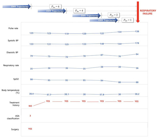 In this study, we retrieved a total of nine features from EMRs to predict two critical events—acute respiratory failure and cardiac arrest. The features used to develop this model were basic vital signs, such as pulse rate, systolic blood pressure (SBP), diastolic blood pressure (DBP), respiratory rate, peripheral oxygen saturation (SpO2), body temperature, recent surgical history (within one week), and current health status (American Society of Anesthesiologists (ASA) classification). The prediction times are taken as 1 h, 2 h, 4 h, and 6 h to analyze the tendency of an adverse event, depending on the prediction time window (Ptw = 1, 2, 4, and 6). To predict the probability of a critical event occurring at a specific time, data recorded from admission to Ptw hours before the event can be used for the model construction. Therefore, as shown in Figure 2, the EMR trajectories up to Ptw hours before the reference point were retrieved to build the feature set of FAST-PACE.