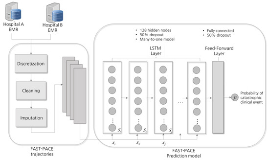 Recently, artificial intelligence (AI) has been introduced in the clinical field, and studies have been published to predict adverse events (including sudden cardiac arrest) several hours before their occurrence and have found that the deep learning model is more useful for detecting high-risk patients compared with the existing EWS [3,4,5,6,7]. Most AI models leverage massive and complicated data, including the various monitoring parameters and laboratory data of electronic medical records (EMRs) collected in hospital information systems [3,6,7,8,9]. Recent studies demonstrate that deep learning, especially associated with recurrent neural networks (RNNs) utilizing long short-term memory (LSTM) or gated recurrent units (GRUs) to predict events using time-series data, outperforms logistic regression based predictions or clinical scores. The reason for this finding is that LSTM or GRUs can suitably control the influence of previous input data with multiple features in every training stage [10,11,12]. These models combine sequential features, including multiple values from laboratory tests or medical devices, and nonsequential features, such as diagnoses or procedures, in data from the intensive care unit (ICU).