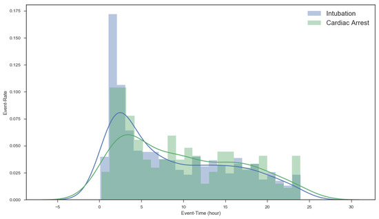 First, we investigated the event distribution of acute respiratory failure and cardiac arrest over time after admission to the ICU in order to demonstrate the importance of predicting adverse events in the 1–6 h after admission. Figure 4 shows a histogram of the 29,181 ICU patients described in Section 2. As seen in the figure, the number of events occurring 1–5 h after admission is relatively high and gradually decreases henceforth.