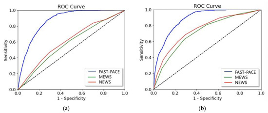 AUROC of FAST-PACE, MEWS, and NEWS predicting (a) acute respiratory failure and (b) cardiac arrest within 6 h.