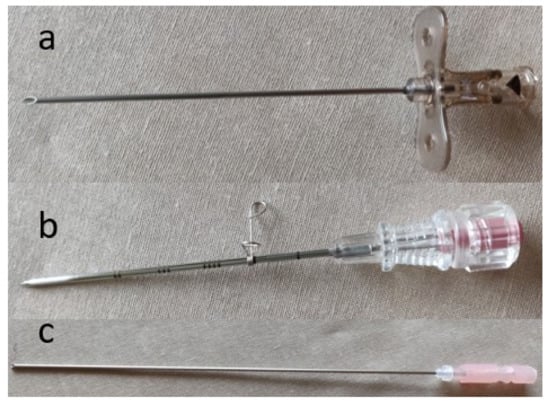 Photograph shows basic needles. (a) Single-wall, hollow-core needle, (b) Trocar needle, and (c) Chiba needle.
