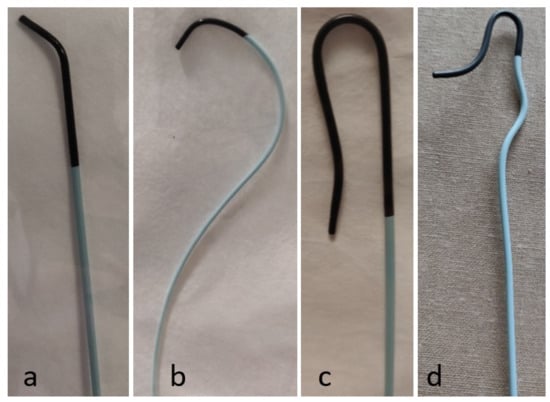 Selective catheters. (a) Berenstein catheter, (b) Cobra 1 cateter, (c) SOS catheter, and (d) Mickelson catheter.