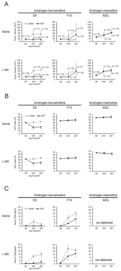 3.1. Effects of ADT on Tumor Growth and Serum PSA Kinetics of Xenograft Derived from Co-Inoculation of E9, F10, and AIDL Cells with pcPrF-M5 Cells In Vivo
