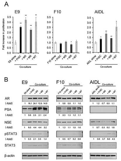 Cell proliferation of E9 and AIDL cells was significantly increased when cells were cocultured with PrSCs or pcPrFs, whereas that of F10 cells was not affected (Figure 2A). Expression levels of PSA proteins were increased in E9 cells cocultured with pcPrFs but not PrSC and were not affected in F10 cells (Figure 2B). In contrast, expression levels of PSA proteins were decreased in F10 cells cocultured with PrSC but not pcPrFs. PSA protein expression was not detected in AIDL cells cocultured with PrSC or pcPrFs (Figure 2B). NSE protein expression and STAT3 phosphorylation were increased in E9 cells cocultured with PrSC or pcPrFs (Figure 2B). NSE proteins were not changed in F10 cells cocultured with PrSC or pcPrFs, whereas STAT3 phosphorylation was increased in F10 cells cocultured with pcPrF-M6 cells (Figure 2B). NSE protein expression was decreased in AIDL cells cocultured with pcPrFs but not PrSC, whereas phosphorylation of STAT3 was increased in AIDL cells cocultured with pcPrFs (Figure 2B).