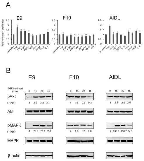 3.3. Effects of Growth Factors and Cytokines on E9, F10, and AIDL Cells In Vitro