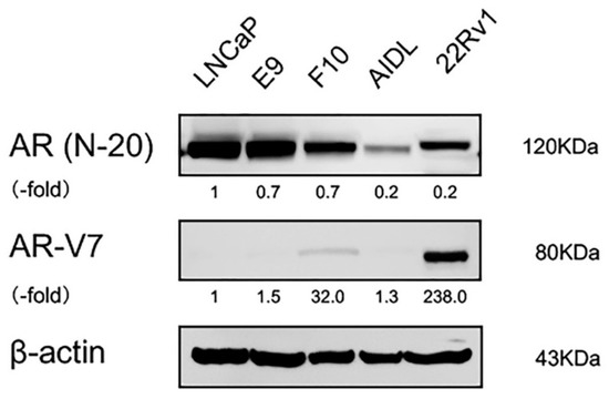 Full-length AR protein was detectable in all PCa cells, including LNCaP, E9, F10, AIDL, and 22Rv1 cells, whereas AR-V7 protein was detectable only in F10 cells (Figure 4). Detection of AR-V7 protein in 22Rv1 cells was used as a positive control for anti-AR-V7 antibodies.