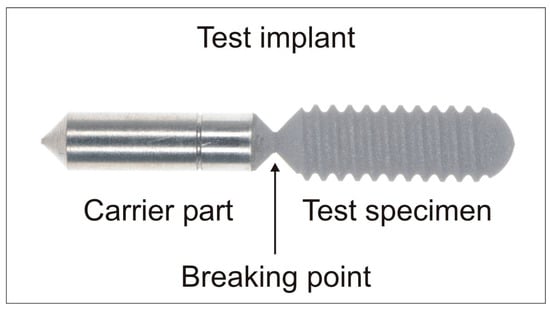 For the study, test implants were designed and produced by the authors to be as close as possible to clinical reality in implant and orthopedic surgery. The test specimens were made of grade 4 and 5 titanium, and consisted of a test and a carrier part (Figure 1). The design of the test part was similar to a standard, parallel-threaded dental implant (∅ 4.0 mm/L = 11.0 mm pitch = 0.6 mm) with different surface modifications. The carrier part was machined to serve as the electricity conductor and to fix the test specimen in the experimental set-up without influencing the area of interest of the test area. Furthermore, the test and carrier part could be separated at a predetermined breaking point to avoid bacterial contamination of the test area during handling.