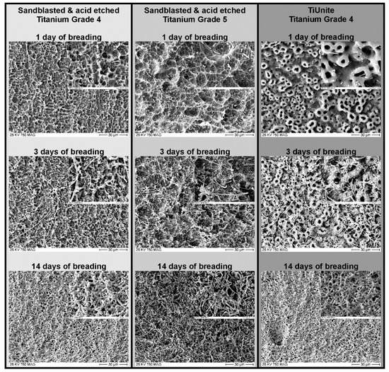To breed the biofilm on the implants, the required bacterial samples were thawed and bred with 300 mL nutrition solution in a beaker at 37 °C for 24 h. The carrier parts of the sterilized implants were masked to reduce bacterial contamination and fixed on a base plate. The experimental set-up was then immersed in the beaker with the culture medium to initiate formation of the biofilm. The beaker was placed in the rocking incubator for 14 days at a temperature of 37 °C. Previous tests with daily checks with a scanning electron micrograph (SEM) had demonstrated that 14 days were necessary to achieve a mature, multilayer biofilm (Figure 2). Every two days, the bacterial culture medium was replaced with freshly prepared nutritional solution.
