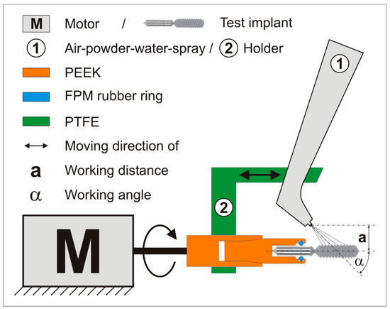 The implants in groups 2, 4, and 6 were treated by a PSS (BA 8000, Mectron GmbH, Cologne, Germany). To ensure a reproducible and comparable cleaning effect, a test apparatus was assembled, as shown in Figure 4. The aim was to reproduce the working angle and distance according to the manufacturer´s operating manual (45° and 10 mm). The test implants were mounted on a sterile PEEK carrier (Figure 4, in orange), which masked three quarters of the carrier part and was then fixed in a PTFE connecting bar (Figure 4). The holder provided the same working angle and distance for all the tested implants. The holder and its fixed handpiece were moved manually along the implant axis while the test implant rotated, being driven by a motor around its axis (40 rpm) to ensure proper and repeatable cleaning of the implants (Figure 4). Sterile water (Aqua ad injectabilia, Braun, Melsungen, Germany) and aminoacetic acid powder (glycine powder, Mectron GmbH, Cologne, Germany) were used with an air pressure of 2 bar being applied for 60 s. The waste liquid produced during the cleaning process was collected in a beaker to prove the vitality of the removed biofilm (waste from air-powder-water cleaning).